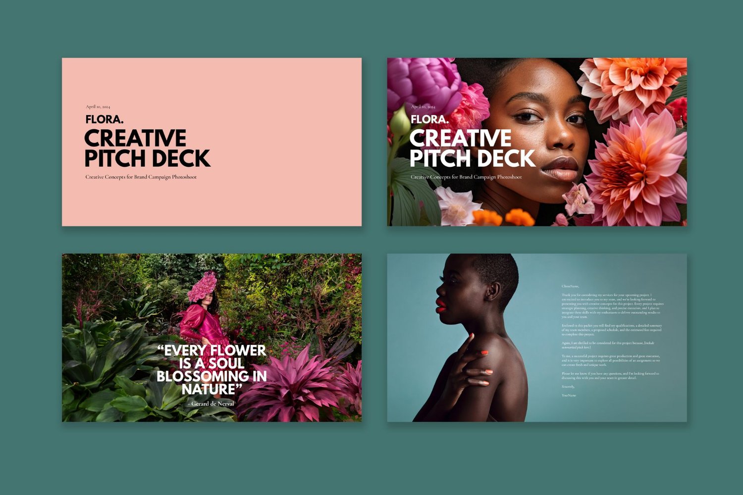Transform your creative pitches with the Flora Pitch Deck Template. With 40 beautifully designed pages to mix and match, it's perfect for photographers, visual artists, and creative agencies looking to present concepts and project proposals with confidence. Turn your creative vision into compelling, client-winning presentations in hours, not days!