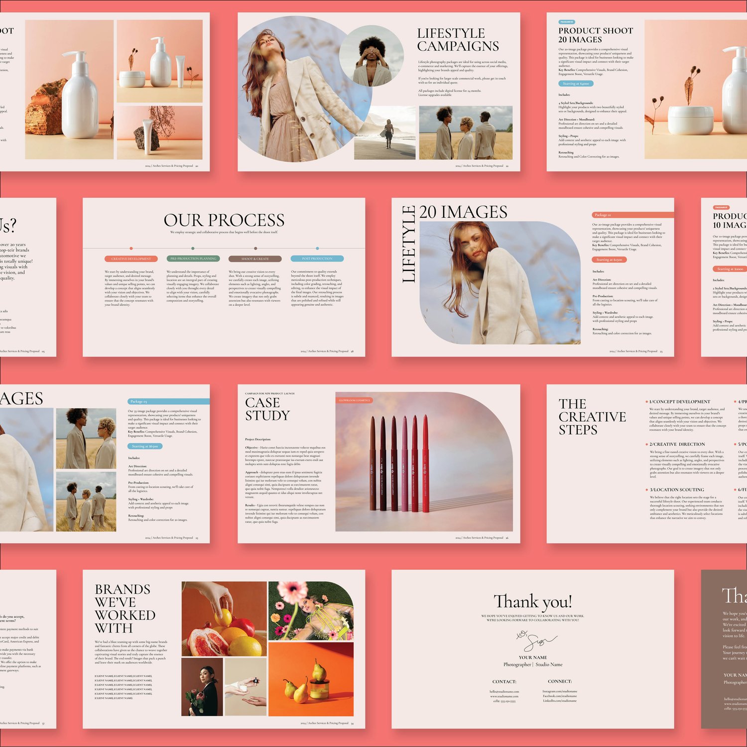 Cover Pages, Contents, Introduction Pages, Brand Values, Quotes/Ethos, About, Work and Portfolio, Services Overview, Packages, Case Study, Our Process, The Team, Client Testimonials, Client List, FAQs, Thank You & Contact, and Galleries.