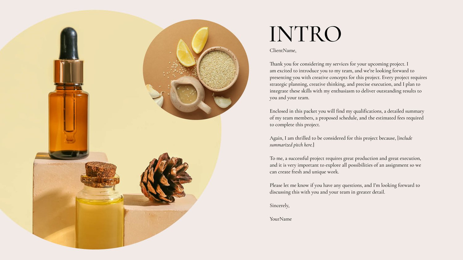 Too much information can overwhelm your audience. Break up those dense text sections with slides that showcase big images, quotes, or brand messaging. Keep a flow of beautiful imagery throughout your presentation and use opportunities outside of the portfolio sections to highlight your best work.